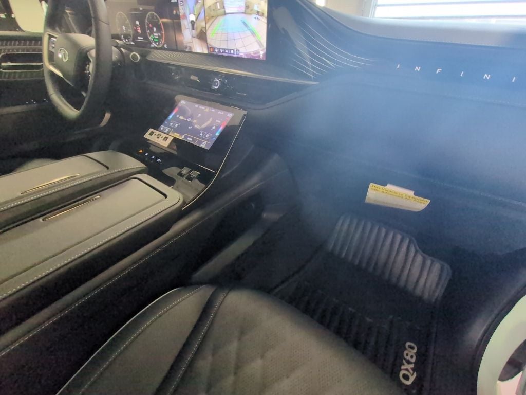 Step inside the QX80 AUTOGRAPH and be enveloped in a world of unparalleled comfort and refinement. The semi-aniline premium leather seating surfaces, heated and ventilated front and rear seats, and massaging functionality provide an unrivaled level of luxury and relaxation. The panoramic illuminated headliner and genuine wood accents further enhance the sophisticated ambiance.