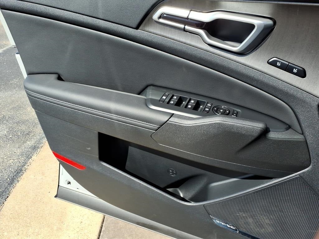 X-Line Premium Package (LED Interior Lighting, Panoramic Sunroof, and Smart Power Liftgate), X-Line Technology Package (LED Front Fog Lights, Parking Collision Avoidance-Assist - Reverse, Parking Distance Warning, Power-Folding Outside Mirrors, and Radio: AM/FM/HD Premium Audio System), AWD, Wheels: 19 x 7.5J Gloss Black Alloy, 4-Wheel Disc Brakes, 6 Speakers, ABS brakes, Air Conditioning, Auto High-beam Headlights, Automatic temperature control, Brake assist, Bumpers: body-color, Cargo Cover, Carpeted Floor Mats, Delay-off headlights, Driver door bin, Driver vanity mirror, Dual front impact airbags, Dual front side impact airbags, Electronic Stability Control, Emergency communication system: Kia Connect (includes 1 year free trial), Four wheel independent suspension, Front anti-roll bar, Front Bucket Seats, Front Center Armrest, Front dual zone A/C, Fully automatic headlights, Heated door mirrors, Heated front seats, Illuminated entry, Leather steering wheel, Low tire pressure warning, Occupant sensing airbag, Outside temperature display, Overhead airbag, Overhead console, Panic alarm, Passenger door bin, Passenger vanity mirror, Power door mirrors, Power driver seat, Power steering, Power windows, Radio: AM/FM/HD Audio System, Rain sensing wipers, Rear anti-roll bar, Rear seat center armrest, Rear side impact airbag, Rear window defroster, Rear window wiper, Remote keyless entry, Security system, Speed control, Speed-sensing steering, Split folding rear seat, Spoiler, Steering wheel mounted audio controls, Tachometer, Telescoping steering wheel, Tilt steering wheel, Traction control, Trip computer, Turn signal indicator mirrors, and Variably intermittent wipers.