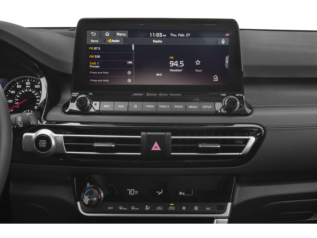 - Radio: AM/FM/MP3 Display Audio -inc: 10.25" touch screen display, navigation, satellite radio, UVO telematics, Bluetooth® wireless technology w/voice recognition, Android Auto, Apple CarPlay, Bose premium audio and sound, wireless charging pad, 12V power outlet, USB multimedia port and steering wheel mounted controls